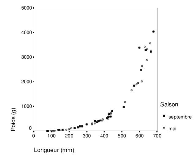 Exemple d'une relation monotone croissante mais non linéaire entre la taille et le poids pour la truite Fario