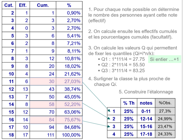 Dans cet exemple la colonne "cat" correspond aux scores bruts observés dans ce test. La colonne "eff" correspond au nombre de personnes (effectif) ayant le score brut observé. La colonne "Cum" est simplement l'effectif cumulé et la colonne "%" est le pourcentage cumulé (facultatif). Le principe est de calculer les valeurs Qi (Qi = i*n/k avec n le nombre d'individu constituant l'échantillon et k le nombre de catégories). Il faut rechercher ensuite le score brut (colonne cat) dont le l'effectif cumulé est le plus proche de cette valeur (cf tableau ci-dessous) afin de construire la table d'étalonnage (ici en 4 catégories) avec pour chaque catégorie l'étendue des scores bruts qui appartiennent à cette catégorie.