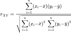 La corrélation (rxy) de Bravais-Pearson (ou Pearson) correspond à la covariance divisée par le produit des écarts-types. La covariance (covxy) est la moyenne des produits des écarts à la moyenne sur chaque mesure. Soit deux mesures (échelles d'intervalles), X et Y, recueillies auprès d'un échantillon de n personnes (on a donc n paires d'observations) :