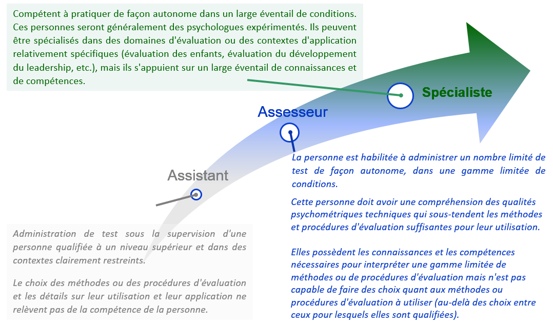 Il existe un « référentiel » général européen qui a été élaborée conjointement par l'EFPA (European Federation of Psychologists' Associations) et l'EAWOP (European Association of Work and Organizational Psychology) pour définir des niveaux d’habilitation pour l'usage des tests. Le schéma ci-dessous résume de façon très simplifiée ces différents niveaux qui par ailleurs restent une recommandation :