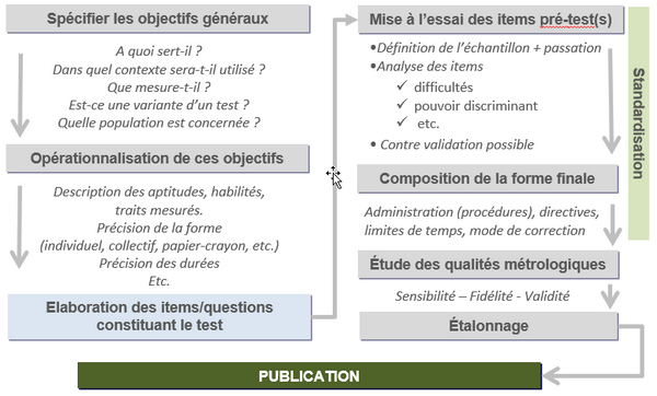 La construction des tests est un processus long qui ne se termine pas nécessairement au moment de sa publication puisque la validation de l'épreuve peut donner lieu à de nombreux travaux complémentaires permettant de préciser les propriétés de la mesure. Dans un manuel de test on doit retrouver tous les éléments qui vont permettre au praticien d'évaluer la qualité de l'outil qu'il souhaite utiliser : objectif du test, sa forme finale, ses qualités métrologiques, l'étalonnage et la date de publication (cf. chap C §1.3 - Manuel des tests). Ces éléments sont, pour la plupart, ceux que l'on retrouve lors de la construction d'un test.