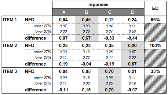 Exemple de grille d'analyse de trois items d'un test avec une bonne réponse parmi 4 (en grisé, la bonne réponse attendue pour l'item). Pour la bonne réponse attendue , l'indice NFD correspond à l'indice de difficulté de l'item (équivalent d'un p-index) et l'indice donné par la colonne différence correspond à l'indice de discrimination de l'item). |