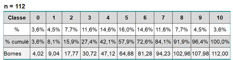 ▪Les deux premières étapes de la procédure ne sont en fait jamais effectuées. En effet, il existe déjà des étalonnages en 11 classes et les pourcentages de chaque classe sont connues (les mêmes pour tous les étalonnages de ce type) et n'ont pas besoin d'être recalculées (sauf si l'on souhaite prendre une étendue différente de celle habituellement utilisée).