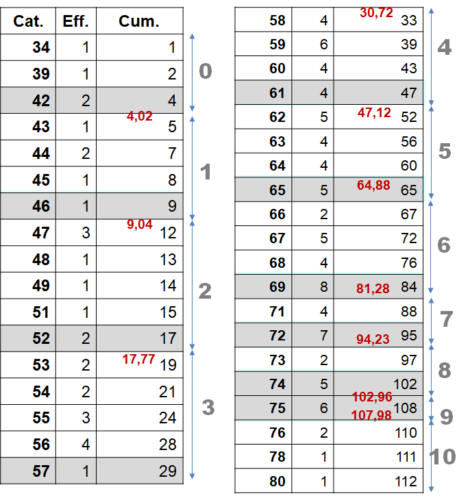 Étape 3. Procéder comme pour un quantilage mais avec les valeurs du tableau précédent. Les bornes ("pseudo-quantiles") sont calculées de la façon suivante :