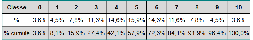 B.Déterminer le pourcentage de personnes de l'échantillon qu'il doit y avoir dans chaque classe (ce qui est possible puisque l'on connaît la distribution de la loi normale théorique : Ν(µ=0, σ=1).