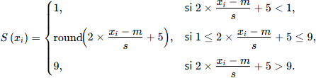 L'expression (xi-m)/s dans la formule précédente correspond à une transformation linéaire du score initial en score z. Cette valeur est ensuite doublée puis on ajoute 5. Le score est arrondi et les valeurs supérieures à 9 sont ramenées à 9 et celles inférieures à 1 sont ramenées à 1.