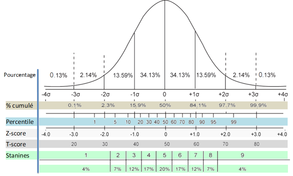 Il est assez facile de passer d'un étalonnage à un autre sous l'hypothèse que la distribution des scores étalonnés est normale. La figure ci-dessous donne quelques correspondances. Ces correspondances sont très faciles à calculer soit même.