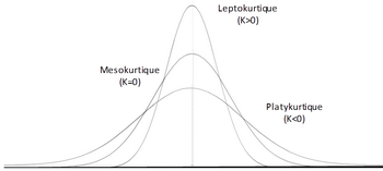 (**) Le terme excès d'aplatissement dérivé de "kurtosis excess" en anglais est utilisé parfois à la place de kurtosis normalisé mais il est ambigu car un excès d'aplatissement positif est une courbe leptokurtique (distribution pointue) et un excès d'aplatissement négatif à une courbe platykurtique (distribution aplatie).