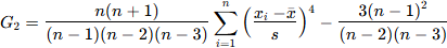 Pour une distribution normale, la valeur de ce coefficient (moment centré d'ordre 4) est de 3 pour une distribution normale. En pratique, on utilise le plus souvent un coefficient corrigé G2 (kurtosis normalisé**). La valeur de ce coefficient est alors de 0 pour une distribution normale (courbe dite alors mésokurtique). Un coefficient d'aplatissement négatif indique une distribution plutôt aplatie (platykurtique) et un coefficient d'aplatissement positif, une distribution "pointue" (leptokurtique). La formule de calcul de ce coefficient d'aplatissement normalisé et non biaisé est :