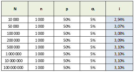 →la taille de la population parente. Ce facteur qui parait évident et qui doit être pris en compte lorsque la population de référence à des faibles effectifs, devient de moins en moins important lorsque l'effectif de la population parente devient très important. Son importance est donc relative (cf. pour aller plus loin, ci-dessous).