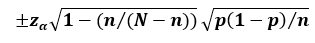 avec : N = taille de la population parente n = taille de l'échantillon p = proportion attendue de choix A dans la population 1-α = degré de confiance (probabilité) i = fourchette (intervalle de confiance pour p, +/- i%) zα = valeur z lu dans la table de la loi normale |