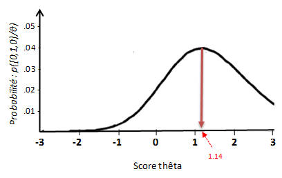 On peut calculer cette probabilité pour chaque valeur de thêta (de -3 à +3) et obtenir ainsi, pour un profil de réponse donné, une courbe de vraisemblance (cf. schéma ci-dessous). Cette courbe passe par un maximum qui correspond à la valeur θ qui sera attribuée à la personne qui a ce profil de réponse. Dans l'exemple ci-dessous, ce score, pour le profil [A1,A2,A3]=[0,1,0] est de 1.14.