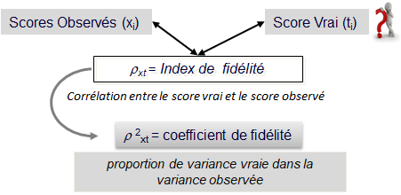 Pour comprendre le concept de fidélité et ses différentes méthodes d'études, nous nous inscrivons dans le cadre de la théorie classique des tests. Dans ce cadre, une mesure observée X, peut être décomposée en deux sources T et ε : X = T + ε (rappel : T est la quantité représentant le score vrai et ε l'erreur de mesure). Onn appelle, index de fidélité la corrélation existante entre les scores observés (X) et les scores vrais (T). Le coefficient de fidélité (ρ2TX) est égal au carré de l'index de fidélité.