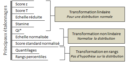 Les étalonnages ne reposent pas tous sur la même métrique. En psychologie, on distingue généralement trois grandes catégories d’étalonnage couramment utilisées. Elles sont classées ici selon la nature de la transformation appliquée aux scores bruts (cf. schéma ci-dessous) :