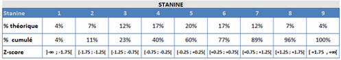 Avec le tableau, l'interprétation est simple. Par exemple un stanine de 3 signifie que l'on se situe autour d'1 écart-type en dessous de la moyenne (z autour de -1) et 73% des personnes (population de référence) ont un score en stanine supérieur. Un stanine de 6 correspond à une note z de autour de 0.5 et 23% ont un score supérieur.